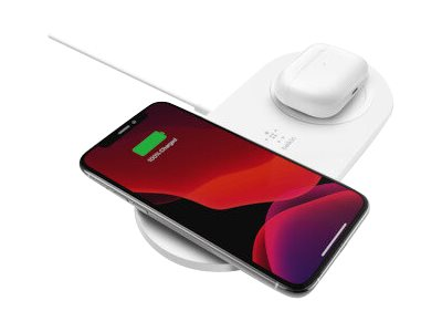 Belkin BoostCharge Dual - Langaton latausalusta + AC-virtasovitin - 15 watti(a) - valkoinen malleihin Apple iPhone 11, 11 Pro, 11 Pro Max, 8, 8 Plus, X, XR, XS, XS Max; Samsung Galaxy Note10, Note10+, S10, S10+, S10e