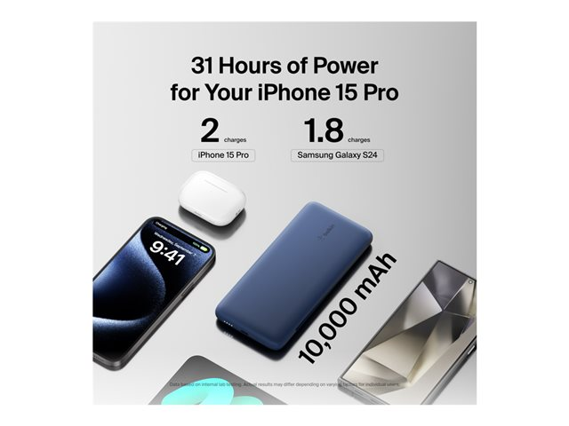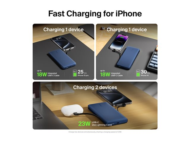Belkin BoostCharge Plus - Virtapankki - 10000 mAh - 23 watti(a) - Fast Charge - 2 lähtöliittimet (Lightning, 24 pin USB-C) - keskiyön sininen BPB006BTBLU