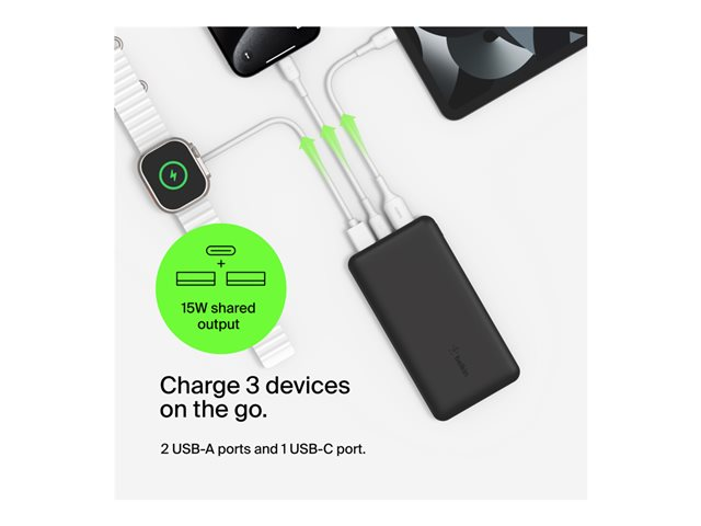 Belkin BoostCharge - Virtapankki - 20000 mAh - 15 watti(a) - 3 A - 3 lähtöliittimet (24 pin USB-C, 2 x USB) - johdossa: USB-C - musta BPB012BTBK
